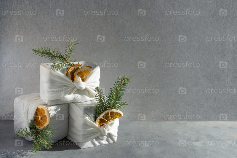 Безотходная подарочная упаковка в традиционном японском стиле фурошики на сером фоне 2022