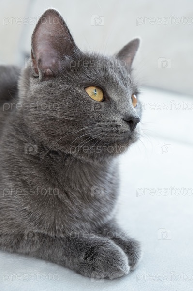Серый кот с желтыми глазами лежит на сером фоне. Всемирный день кошек
