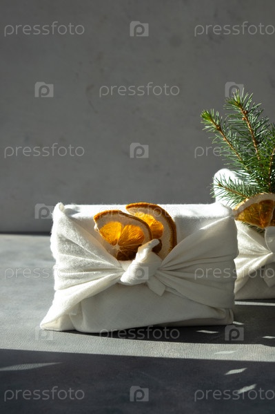 Безотходная подарочная упаковка в традиционном японском стиле фурошики на сером фоне 2022