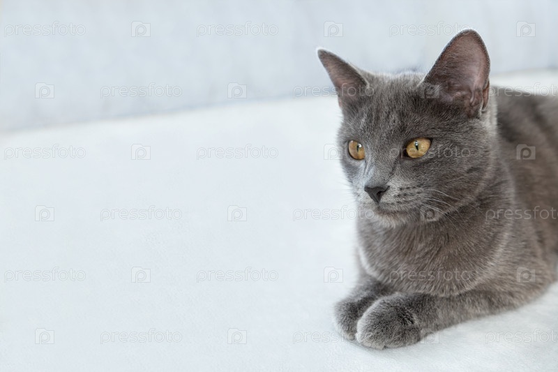 Серый кот с желтыми глазами лежит на сером фоне. Всемирный день кошек