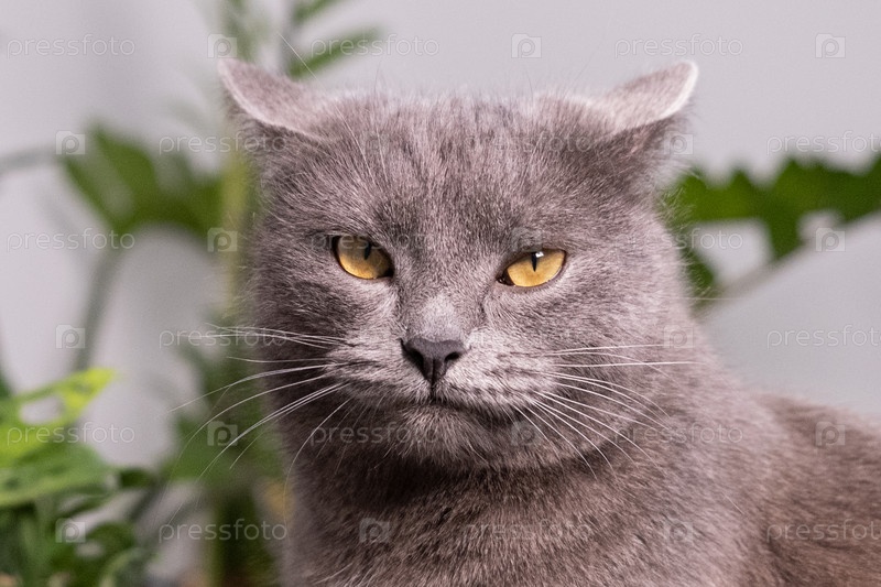 Портрет короткошерстной серо-голубой домашней кошки с большими желтыми глазами шотландской серой полосатой кошки. Очаровательный питомец с зеленым комнатным растением. Британский короткошерстный серый кот с большими широко открытыми оранжевыми глазами