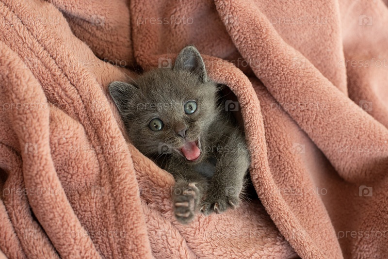 Маленький серый кот в одеяле зевает. Длинный язык