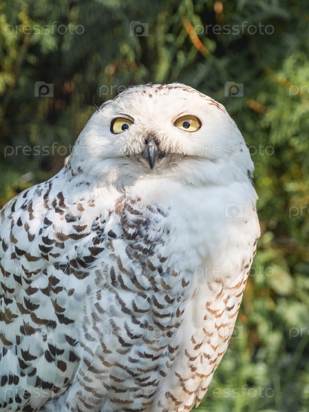 Портрет снежной совы. Ночная птица с монохромными перьями при дневном свете. Никтея Скандиака