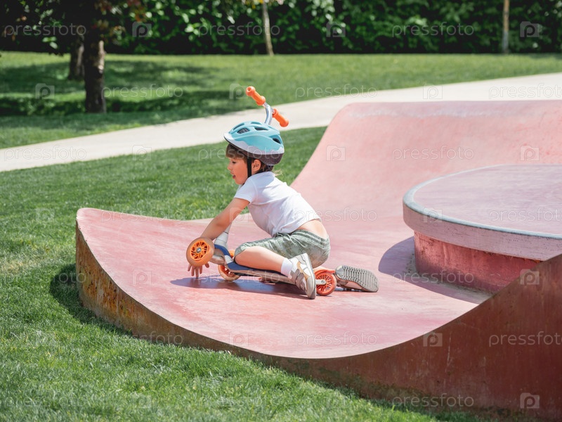 Маленький мальчик упал с самоката во время катания в скейт-парке. Специальные бетонные чаши в городском парке. Обучение катанию на коньках летом