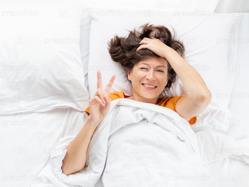 Вид сверху на сонную женщину, показывающую жест победы в постели. Женщина растягивается, лежа на белом постельном белье. Приятное пробуждение. Хороший сон