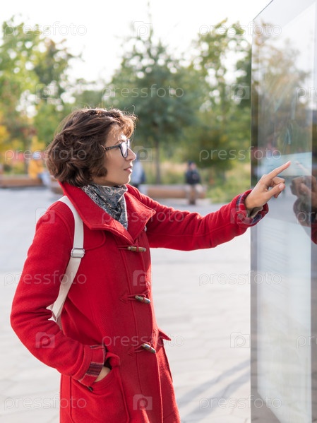 Кудрявая женщина в красном пальто прокручивает экран на внешнем электронном навигационном устройстве. Современные электронные панели на улицах для электронной коммерции или туристических карт