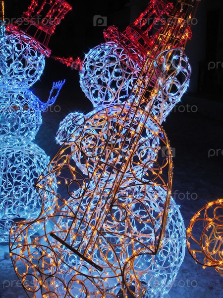 Джаз-банд веселых снеговиков. Концерт всю ночь. Новогодняя иллюминация. Концепция Нового года и Рождества. Волшебный сочельник