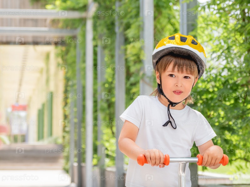 Маленький мальчик катается на самокате в скейт-парке. Портрет ребенка в шлеме на фоне зеленых листьев. Обучение катанию на коньках летом