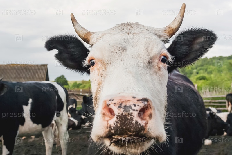 Крупным планом портрет любопытной коровы среди стада коров и быков. Молочные животные пасутся в загоне. Животноводство в сельской местности