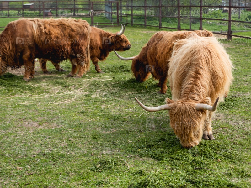 Хайленд шотландская порода деревенского скота. Пушистые коровы едят свежую траву в загоне