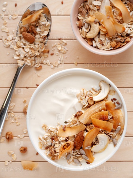 Миска йогурта с мюсли, овсянкой, орехами и кокосовой стружкой на деревянном фоне