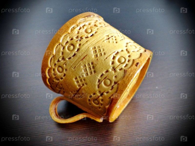 Чашка из бересты на темном фоне. Кухонные принадлежности. Народные промыслы России. Ретро. Изделия из бересты изготавливались большинством обществ задолго до того, как была изобретена керамика