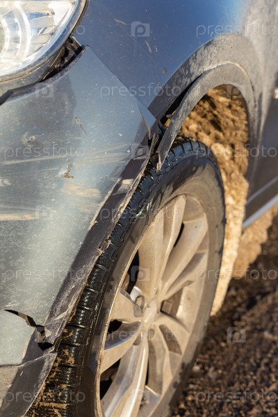 Передняя часть серого кроссовера повреждена в результате аварии на дороге. Концепция ремонта автомобиля или страхования автомобиля. Переднее крыло, легкие повреждения и царапины на бампере