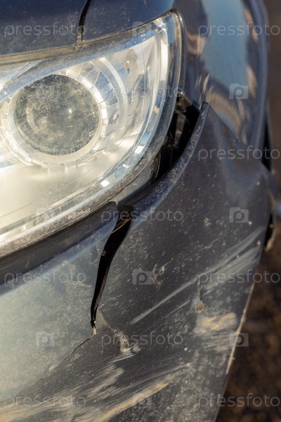 Передняя часть серого кроссовера повреждена в результате аварии на дороге. Концепция ремонта автомобиля или страхования автомобиля. Переднее крыло, легкие повреждения и царапины на бампере