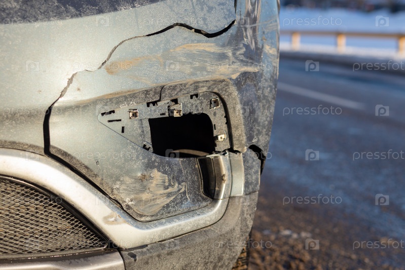 Передняя часть серого кроссовера повреждена в результате аварии на дороге. Концепция ремонта автомобиля или страхования автомобиля. Переднее крыло, легкие повреждения и царапины на бампере