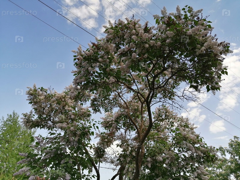 Высокая сирень на фоне неба с проводами