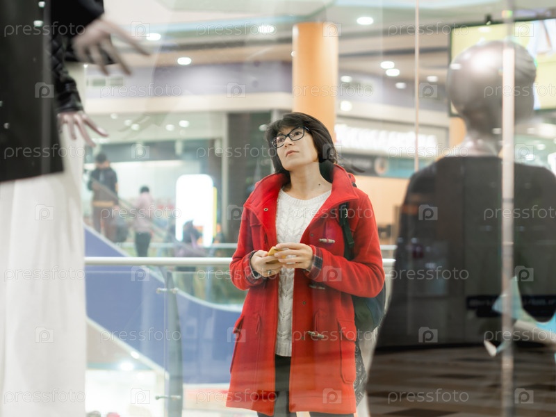 Женщина смотрит на манекенов в магазине одежды. Повседневная одежда висит на манекенах. Вид через прозрачную витрину. Покупки в торговом центре. Базовая одежда для повседневной носки. Современная городская мода