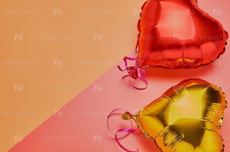 Воздушные шары из фольги в форме сердца, красные и золотые, на розовом фоне. Концепция любви, День святого Валентина, торжество, праздник. Металлический шар. Плоская укладка. Место для копирования. Баннер