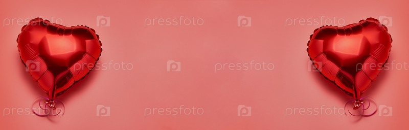 Воздушные шары из фольги в форме сердца, красные и золотые, на розовом фоне. Концепция любви, День святого Валентина, торжество, праздник. Металлический шар. Плоская укладка. Место для копирования. Баннер
