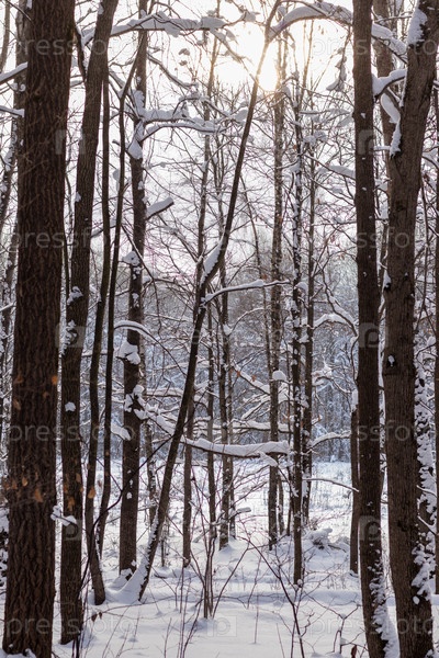 Зима. Лесные деревья, покрытые свежим пушистым снегом