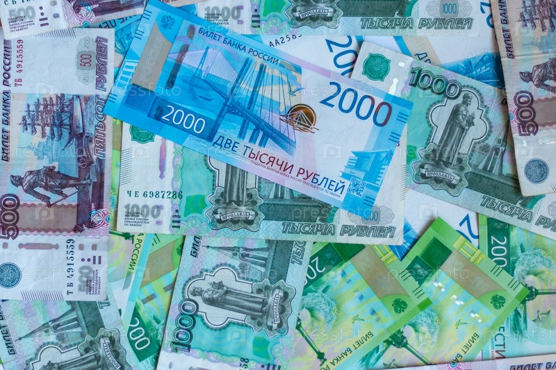 Российский рубль, деньги, банкноты разных номиналов. Банкноты российских денег, фон, текстура