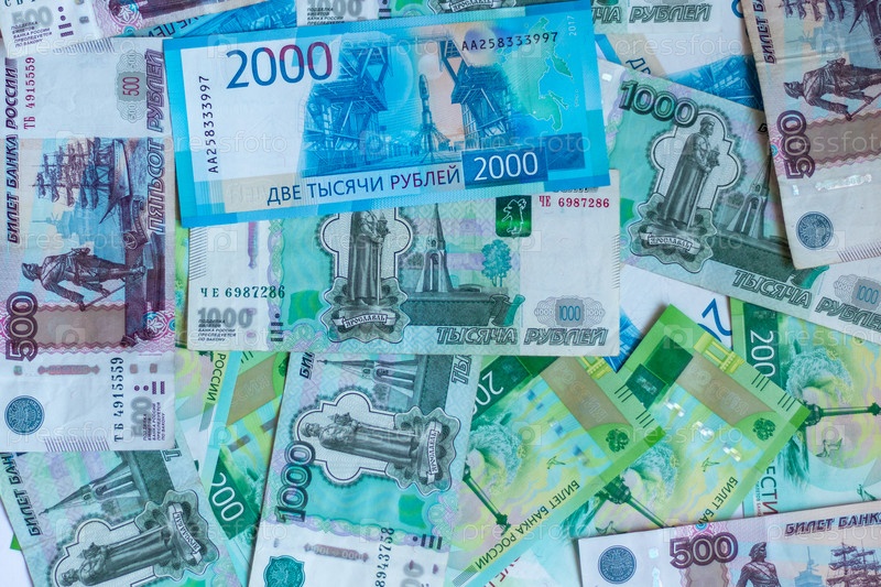 Российский рубль, деньги, банкноты разных номиналов. Банкноты российских денег, фон, текстура