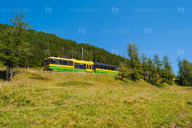 Поезд движется в горах Швейцарии