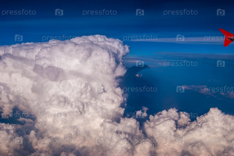 Вид сверху на облака и голубое небо из окна самолета, фон природы
