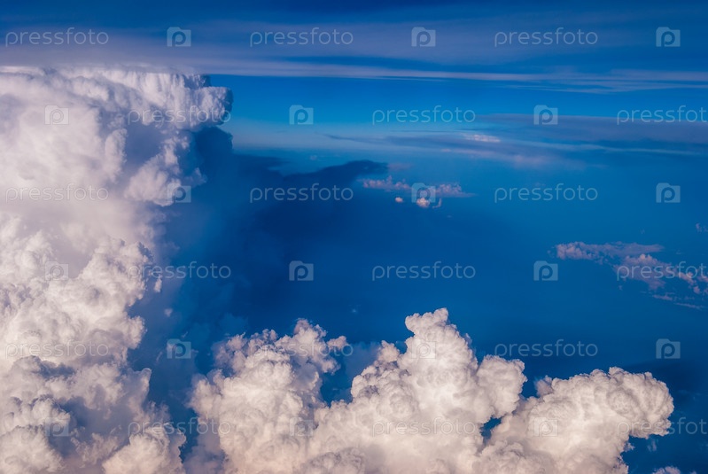 Вид сверху на облака и голубое небо из окна самолета, фон природы