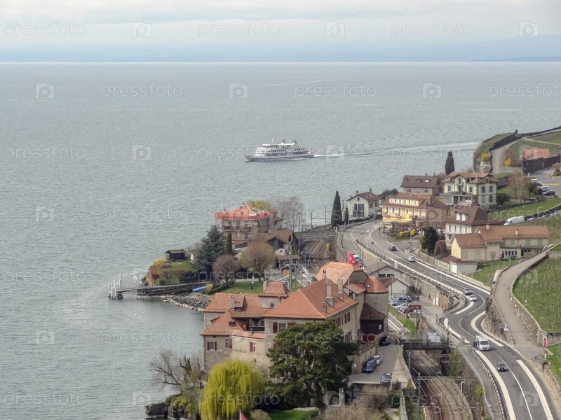 Пейзаж весной, вид на виноградники региона Лаво над озером Леманн - Женевское озеро - с французскими Альпами, голубым небом и белыми облаками, Швейцария