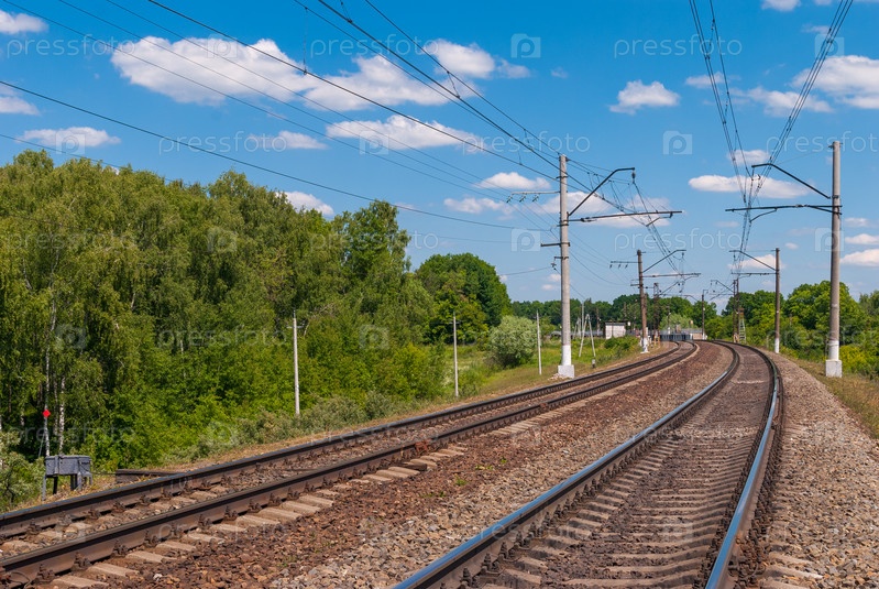 Электрифицированная двухпутная железная дорога в России в солнечный день
