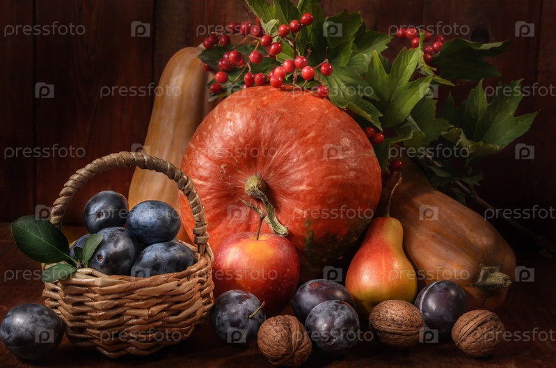 Тыквы, груши, сливы и другие ягоды и фрукты оптом на темном деревянном фоне в деревенском стиле
