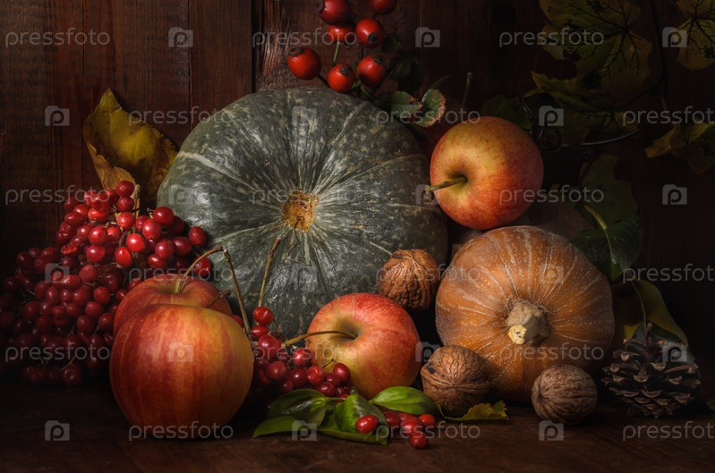 Яблоки и тыква на темном деревянном фоне в деревенском стиле