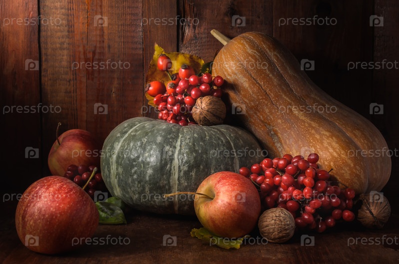 Яблоки и тыква на темном деревянном фоне в деревенском стиле
