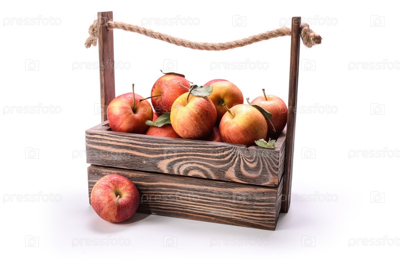 Яблоки в деревянном ящике на белом фоне с мягкой тенью