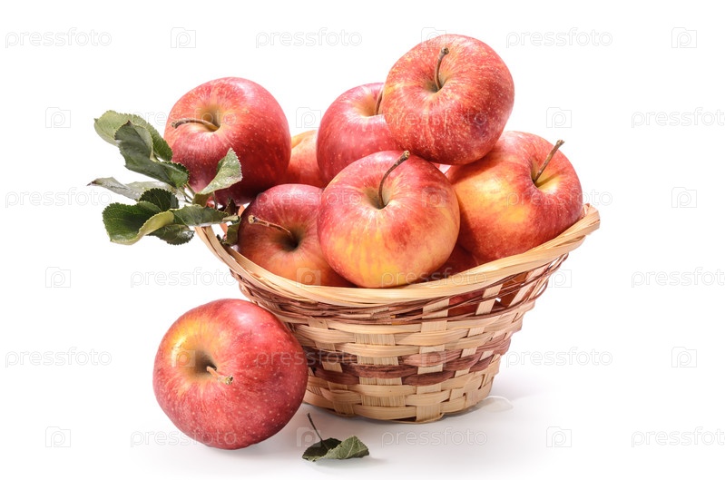 Яблоки в корзине и другие фрукты на белом фоне с мягкой тенью