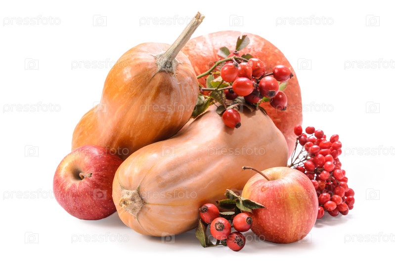 Тыква и другие фрукты на белом фоне с мягкой тенью