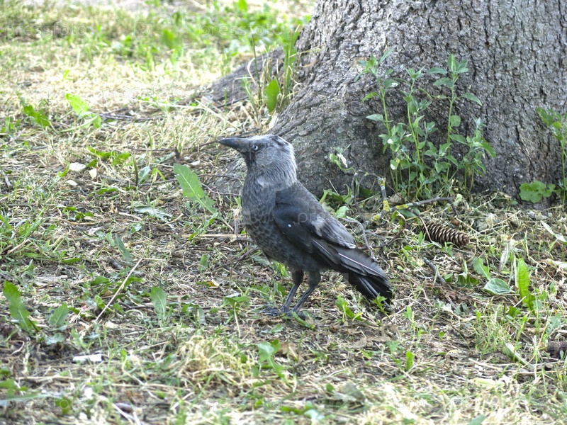 Черная галка гуляет и выпрашивает еду в летнем скверике