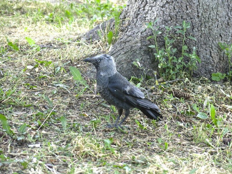 Черная галка гуляет и выпрашивает еду в летнем скверике