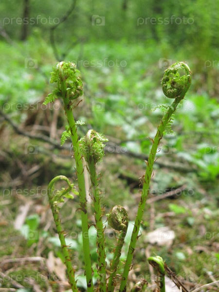 Молодые зеленые побеги папоротника весной в лесу