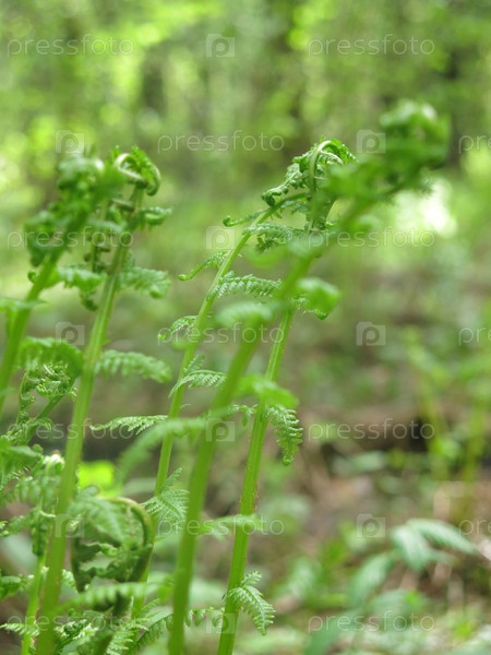 Молодые зеленые побеги папоротника весной в лесу