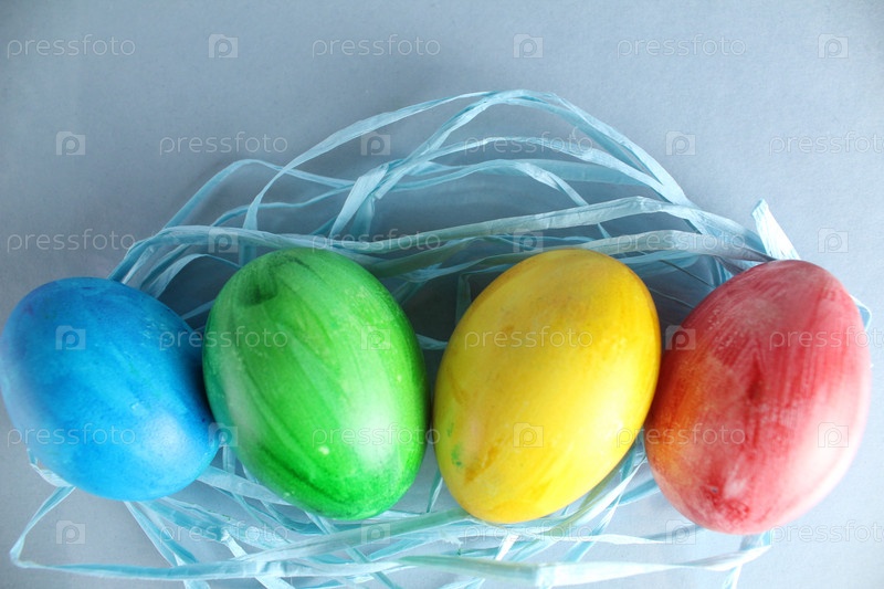 Пасхальный фон разноцветные крашеные яйца синий зеленый желтый красный на голубом фоне с местом для текста вид сверху с копирайтом