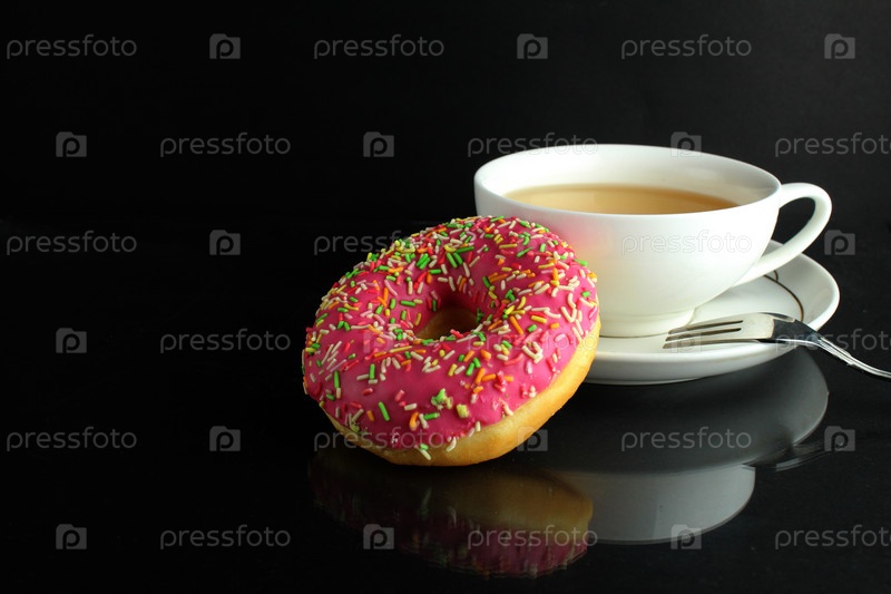Донец с розовой глазурью по-берлински лежит рядом со стаканом кофе, чая, вкусным завтраком, закуской, днем без диеты на черном фоне copyspace