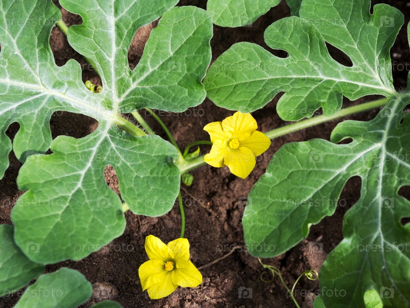 Цветение арбуза. Зеленые листья арбуза с цветами