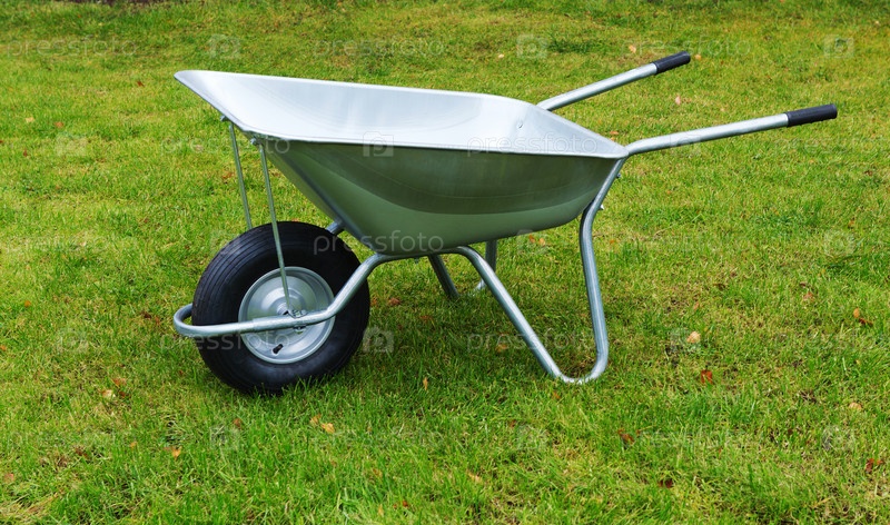 Тачка на поле зеленой травы. Тачка садовая металлическая