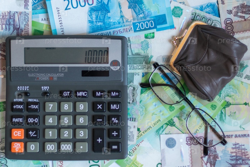 Российские рубли, очки, кошелек с мелкими монетами и калькулятор на столе