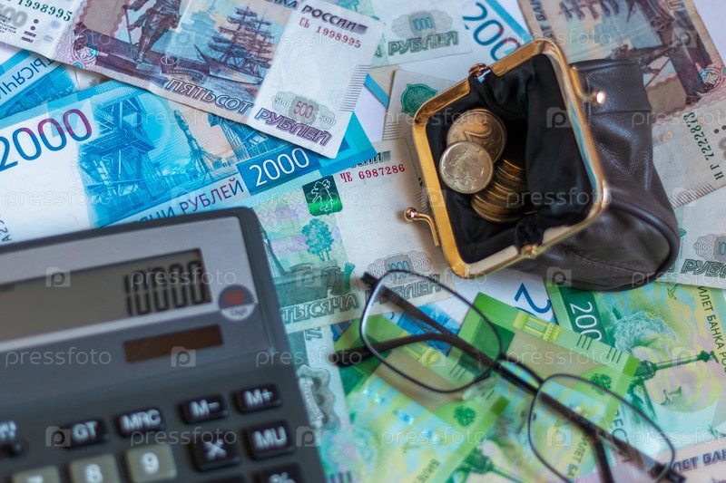 Российские рубли, очки, кошелек с мелкими монетами и калькулятор на столе