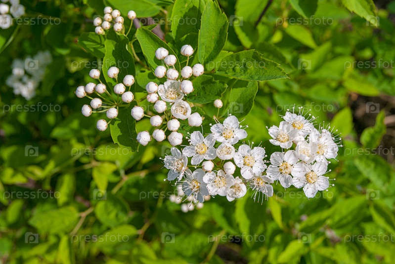 Цветы Spiraea vanhouttei цветут в солнечный день с капельками росы