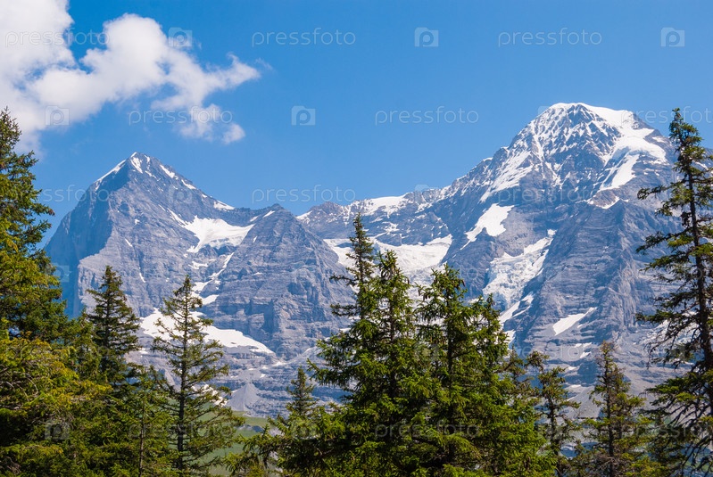 Красивый летний горный пейзаж с видом на пик Эйгер и пик Монч. Бернский Оберланд, Швейцария