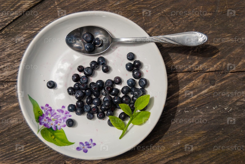 Натюрморт с черникой на белой тарелке из грубых досок